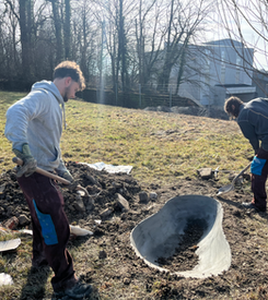 In the Tännlimoosweid and Oberwilerwald areas, the focus was on promoting the yellow-bellied toad by creating toad pits. In the Tännlimoosweid area, this first involved removing dense dogwood and blackberry bushes to create sufficient space. At the same time, the resulting light conditions improved the living conditions of the toads. In the Oberwilerwald area, the existing toad habitat was to be expanded with additional pits. The installation of the lightweight Eternit pits is carried out entirely by hand. The soil conditions play a crucial role in optimal installation. In teams of two, a precisely fitting hole in the shape of the toad pit is first dug using a shovel, spade, and pickaxe.