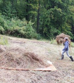 To ensure that the ecologically important meadows remain rich in species and do not become overgrown, they must be mown regularly. Before mowing, the volunteers remove all neophytes. Depending on the type of meadow, the grass is mown once or twice a year using a scythe mower and brush cutter, with 10-15% of the area being left as a retreat strip so that there is still a sufficient supply of food and retreat areas for small animals. After mowing, the cuttings are left for a few days so that small animals can move into the parts of the meadow that have been left standing and plant seeds can fall from the seed heads. Using hay rakes and forks, drag tarpaulins and cable winches, the volunteers collect the cuttings, load them up and transport them away in cooperation with local farmers.