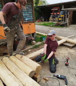 Für die meisten Stationen verwendeten wir Eichenstammholz aus dem benachbarten Forstrevier Niderholz, welches wir direkt vom Holzpolder bezogen und zur längeren Haltbarkeit am Mattenhof mit einem Holzentrindungsgerät in Handarbeit vom weichen Splintholz befreiten.